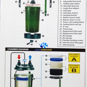 2. Phụ kiện Máy lọc hồ cá – lọc treo có đầy đủ sứ lọc, mút lọc đen và bông lọc trắng.